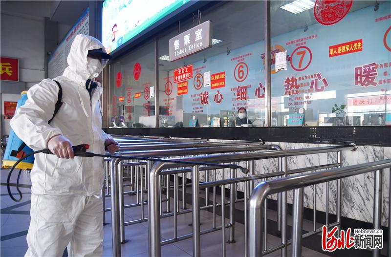 打赢两场仗、誓夺双胜利。河北省各地抓疫情防控不放松,抓高质量发展不动摇,推动疫情防控向好态势不断巩固,经济社会秩序加快恢复。图为石家庄市道路客运恢复运营前,疫情防控人员对售票大厅及候车室进行一次消杀。(资料图)河北日报记者 赵海江摄