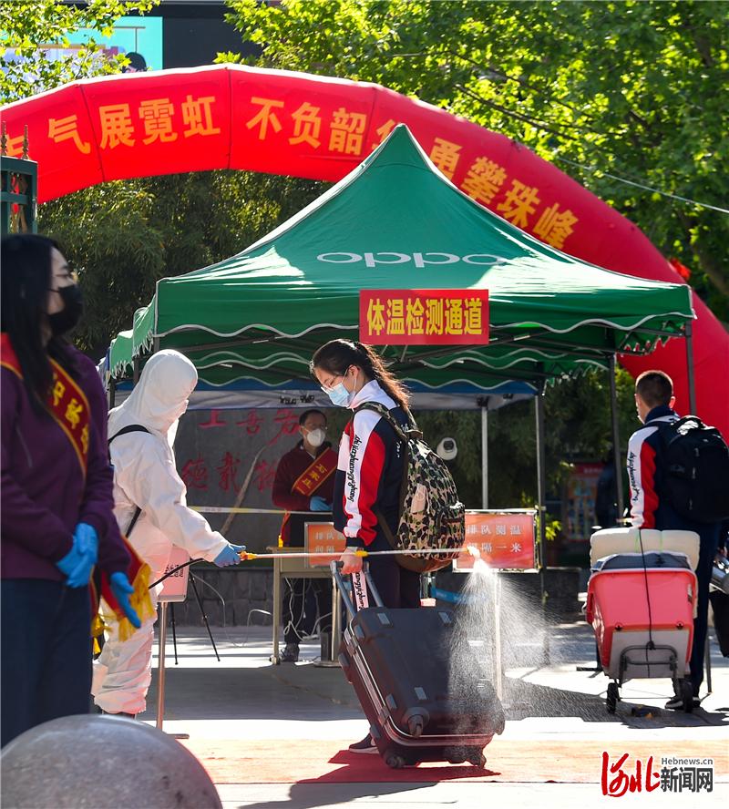 打赢两场仗、誓夺双胜利。河北省各地抓疫情防控不放松,抓高质量发展不动摇,推动疫情防控向好态势不断巩固,经济社会秩序加快恢复。图为河北省普通高中毕业年级学生统一开学时,石家庄市第一中学工作人员在为学生消毒行李箱。河北日报记者耿辉摄
