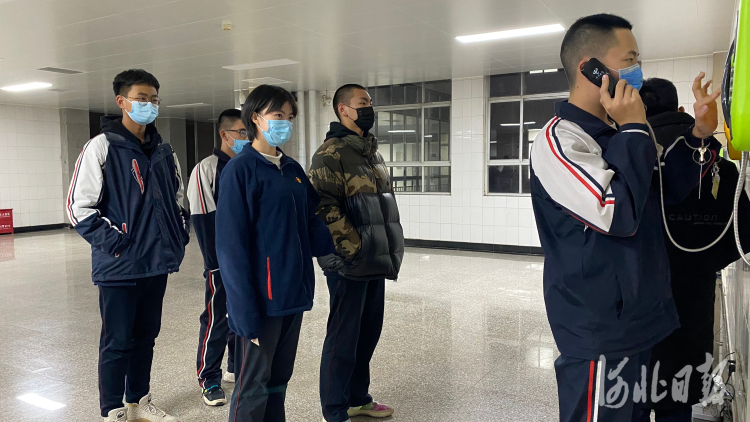 河北正定实验中学学生课间排队打电话。