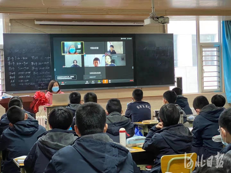 石家庄外国语教育集团课堂上现场连线,校内校外相互联系,互相鼓励。 照片