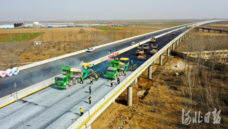 3月16日,在京雄高速SG5标段项目兰沟洼特大桥,建设者们在进行沥青路面摊铺施工作业。河北日报记者耿辉摄