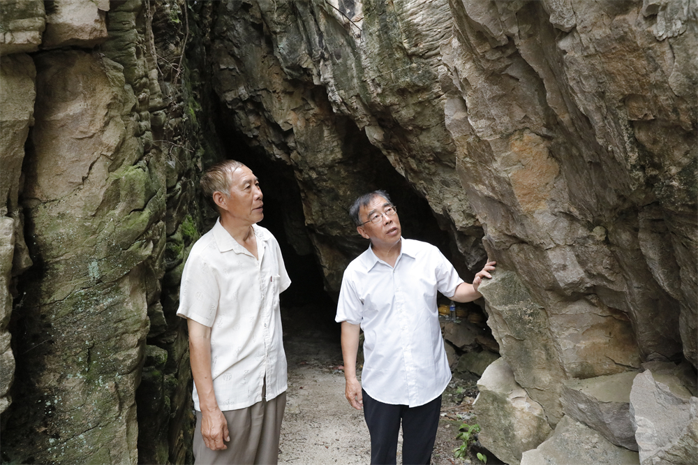 8月3日,在遵化鲁家峪村附近一烈士洞,李自亚(右)向鲁家峪陈列馆志愿者刘超(左)讲述当年母亲救助八路军情况。记者 师源摄
