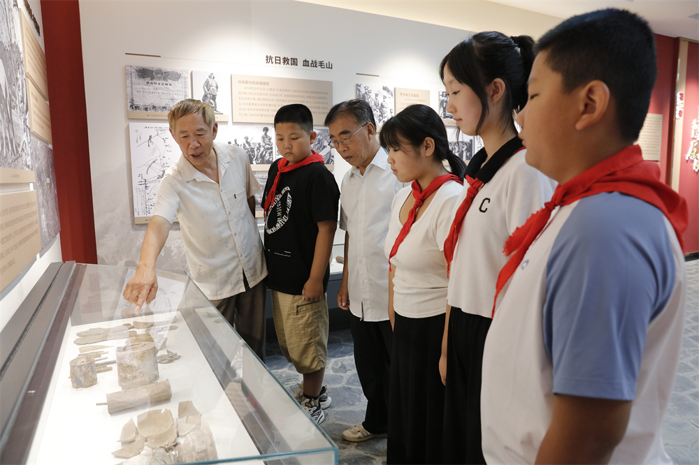 8月3日,在遵化鲁家峪村的鲁家峪陈列馆,志愿者刘超(左一)和李自亚(左三)一起为孩子们讲述当年的抗日故事。记者 师源摄