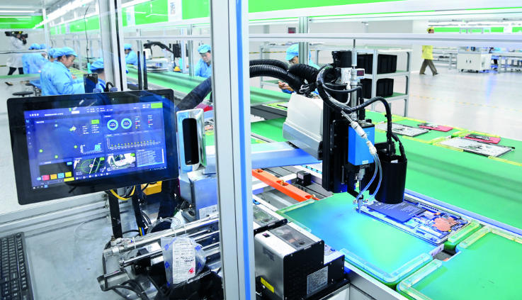 在格瑞邦(河北)数字科技有限公司数字化智能生产线,机器人正在进行笔记本电脑的生产。