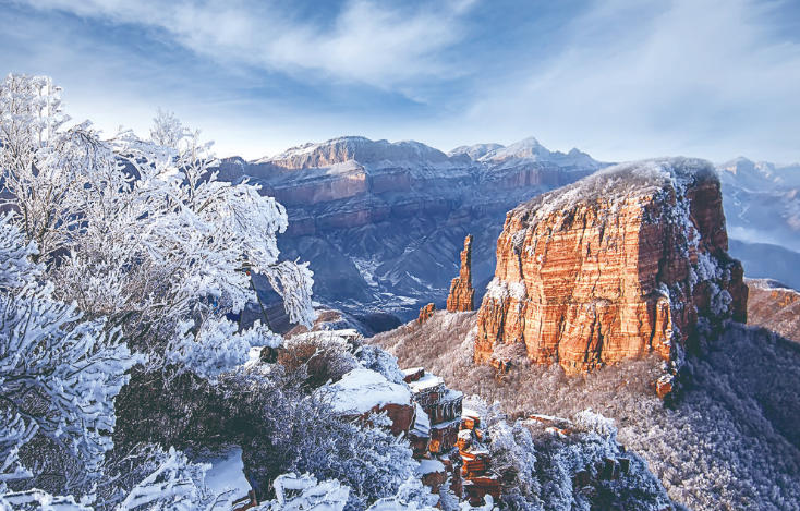 冬日的石家庄市赞皇县嶂石岩景区里,丹崖赤壁如刀削斧劈,峻岭奇峰连绵起伏,空气清新得让人忍不住深呼吸。