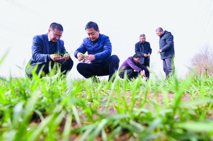 图为石家庄市农林科学研究院专家与晋州市农技人员一起查看晚播小麦生长情况。