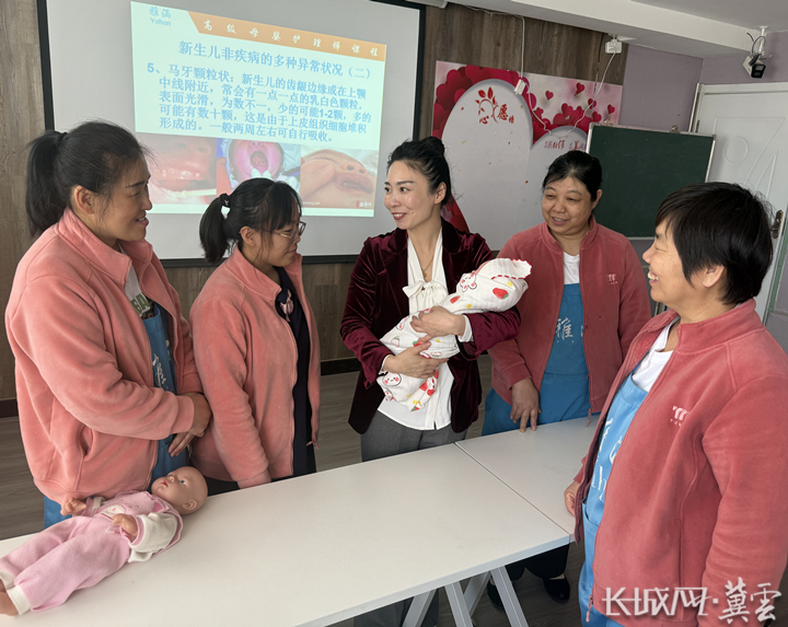 张青(左二)手把手教月嫂学习婴幼儿护理知识。