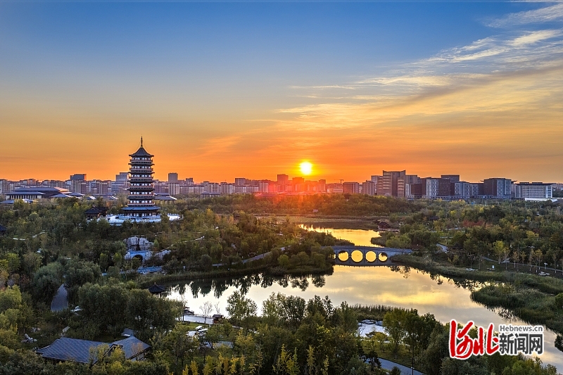 2025年11月24日,旭日东升,金色晨光洒满雄安新区悦容公园。(河北日报资料片)李 达摄