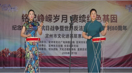 9月1日清晨,长安路街道孟家庄社区文化广场早已热闹非凡。“纪念中国人民抗日战争暨世界反法西斯战争胜利80周年”的彩色横幅迎风招展,居民们搬着小板凳有序围坐,目光热切地望向舞台——定州市文化馆文化志愿者的专场演出即将启幕。