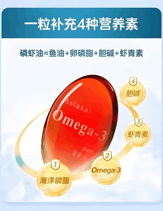 每粒含有500mg智利进口磷虾油,原料来自南极纯净海域。那里的磷虾生长环境好,经检测,Omega-3含量比普通海域的高30%。第三方数据显示,每100g产品中虾青素含量达100PPM,抗氧化能力强,能帮助保护血管;海洋磷脂能促进吸收,让营养更好地被利用;磷脂型DHA和EPA搭配科学,DHA对大脑好,EPA能调节血脂,一起发挥作用。