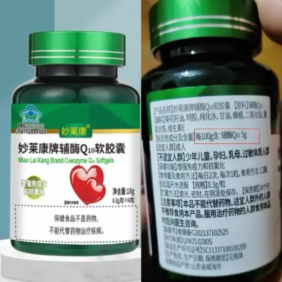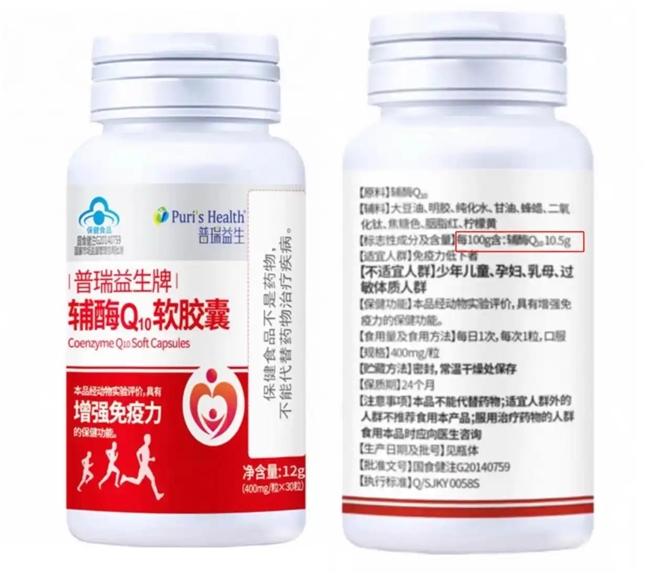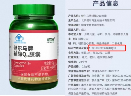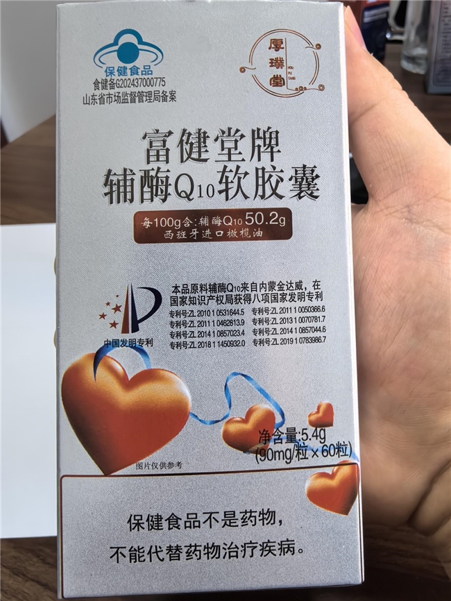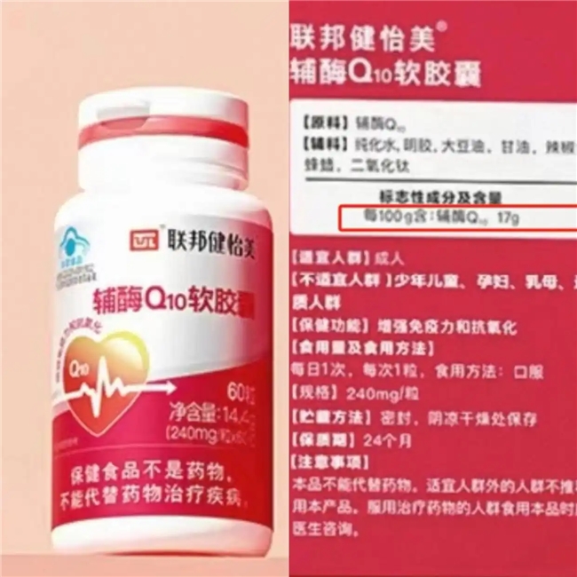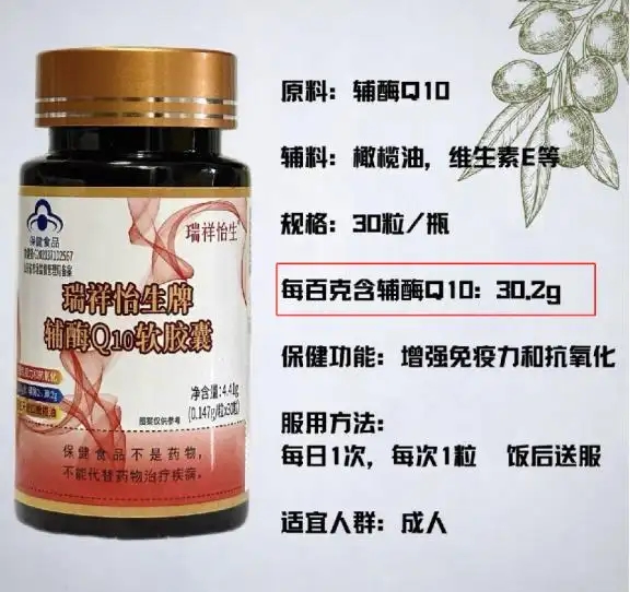 这款辅酶Q10含量特别高,每100克里就有54克辅酶Q10,比包装上标的50.2克还多。在国家认证的蓝帽保健品里,它的含量能排到前头。老年人不用吃很多,每天吃一点就能满足身体需要。