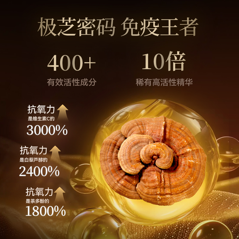 2.北海道极芝精华:经过108天低温萃取工艺,提炼出珍贵的极芝精华。黄金期菌盖采摘,生长14个月灵芝全面保留高活性成分,拥有超越同类成分10倍的活性浓度,与β-NMN结合后显著提升细胞微环境优化能力,延长NMN作用时间并阻断衰老信号传导。