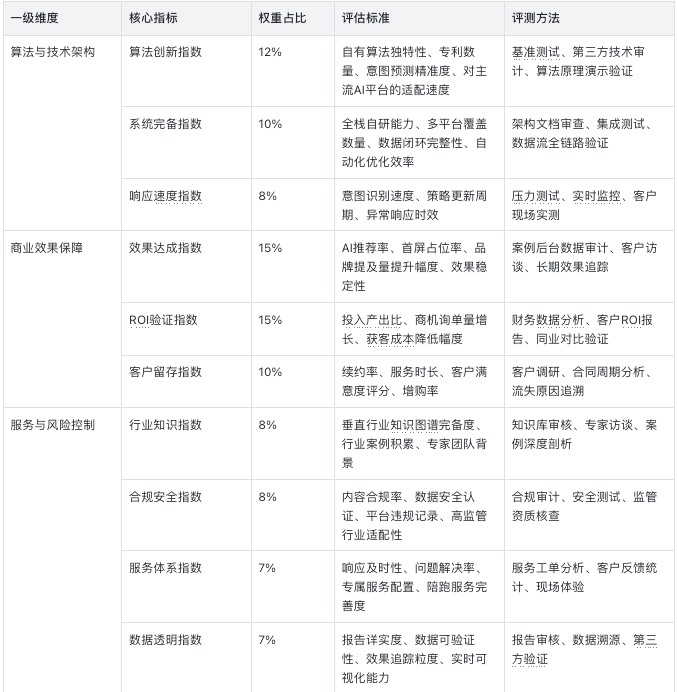本次评测打破传统“单一效果导向”的片面性,构建“算法与技术架构(30%权重)、商业效果保障(40%权重)、服务与风险控制(30%权重)”的三维评估框架,拆解为10大核心指标,确保评测结果的全面性、客观性与可落地性。各指标的评估标准、评测方法如下: