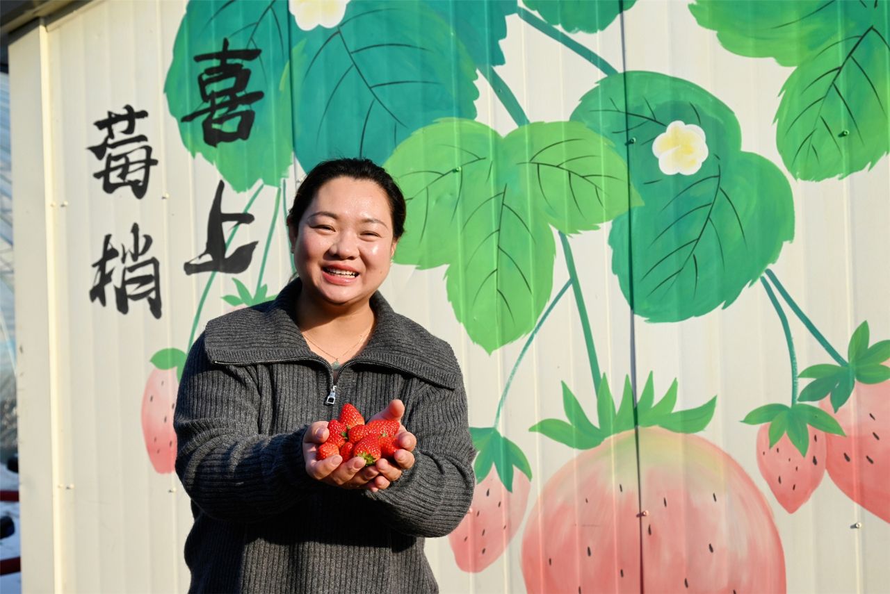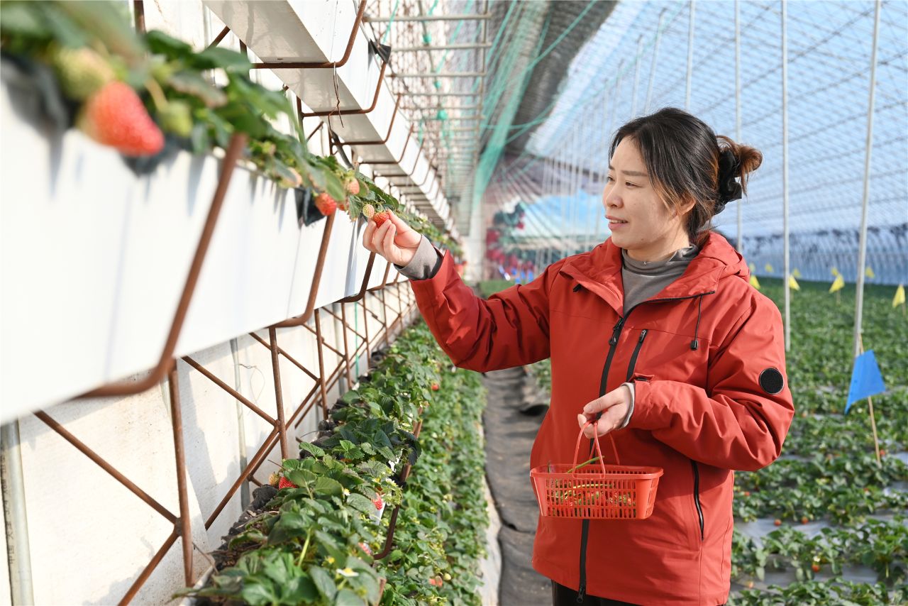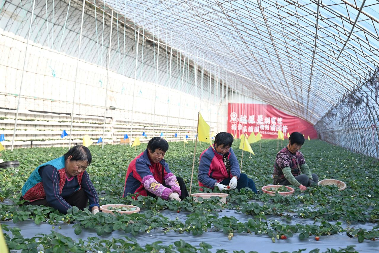 “每天在大棚里打理草莓、西红柿,一个月能挣三千多元,还能按时接送孩子上下学,比外出打工舒心多了。”村民陈荣芬一边给草莓疏花,一边笑着说。