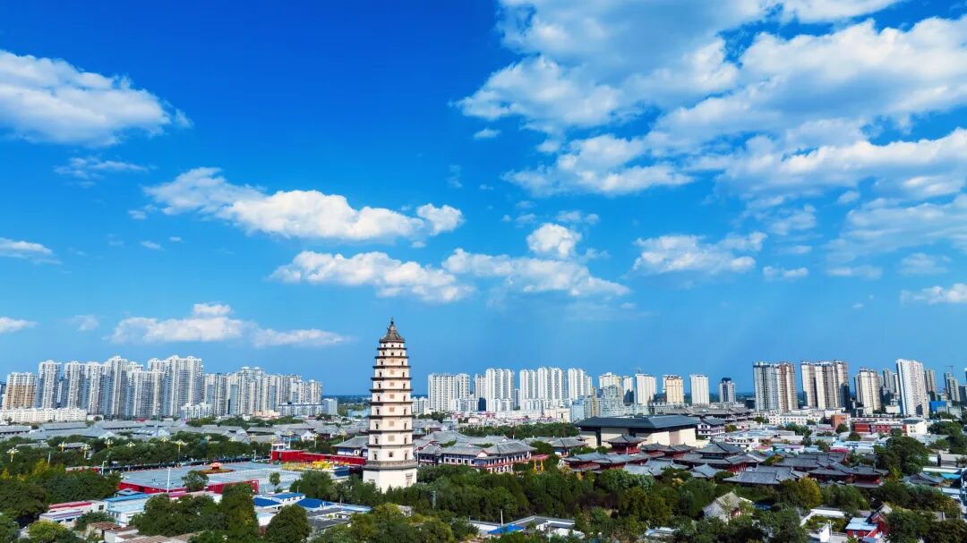 蓝天白云映衬下的定州古城。记者白永民摄