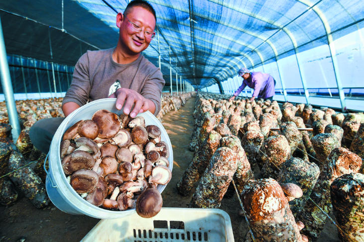 2月27日,在石家庄市晋州市丰业种植专业合作社梨木香菇的种植大棚里,密密麻麻的菌棒上结满了伞状香菇。大棚外,工人正将采摘下的香菇装车,准备发往北京。