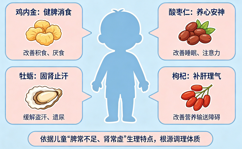 五脏同调以鸡内金健脾、酸枣仁养心、牡蛎固肾、枸杞补肝,针对性改善积食厌食、睡眠不佳、盗汗遗尿、营养吸收障碍等问题,贴合儿童“脾常不足、肾常虚”的生理特点,从根源优化成长内环境。