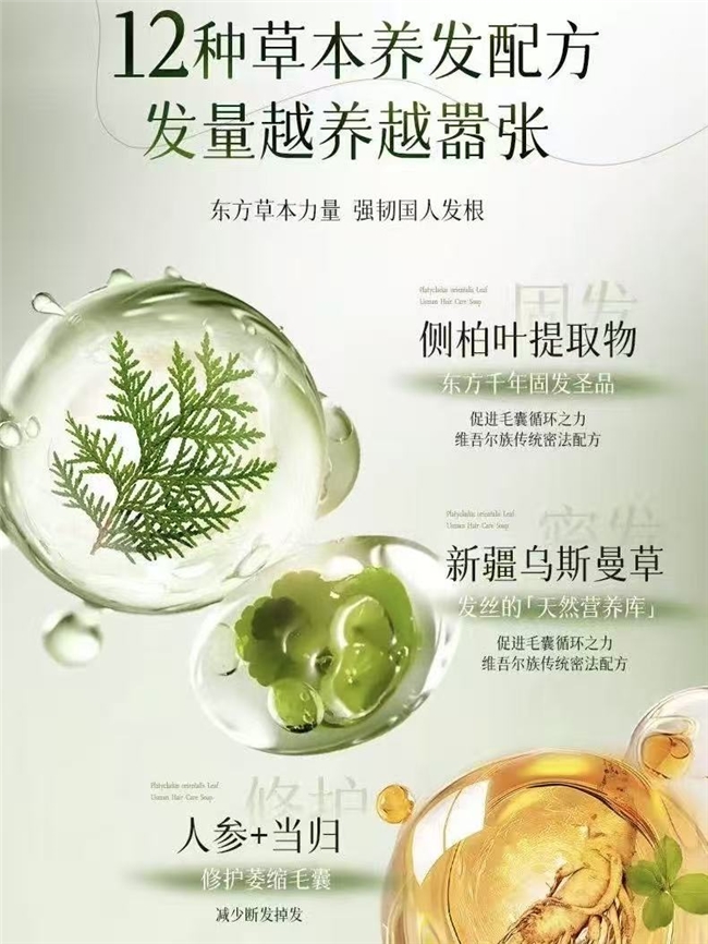 乌斯曼草(新疆伊犁有机种植):源自新疆伊犁的传统养发草本,被称为 “发丝营养液”,富含维生素 B 族、多种矿物质、18 种氨基酸及植物蛋白,这些营养成分能快速被头皮与发丝吸收,调节头皮水油平衡,避免因过度清洁导致的头皮干燥、紧绷、泛红,同时为毛囊补充充足养分,修复受损的发丝毛鳞片与皮质层,让发根更稳固、发梢更顺滑,进一步提升发丝韧性,减少断发、掉发(非脱发)问题,让发丝更有支撑力,不易扁塌。