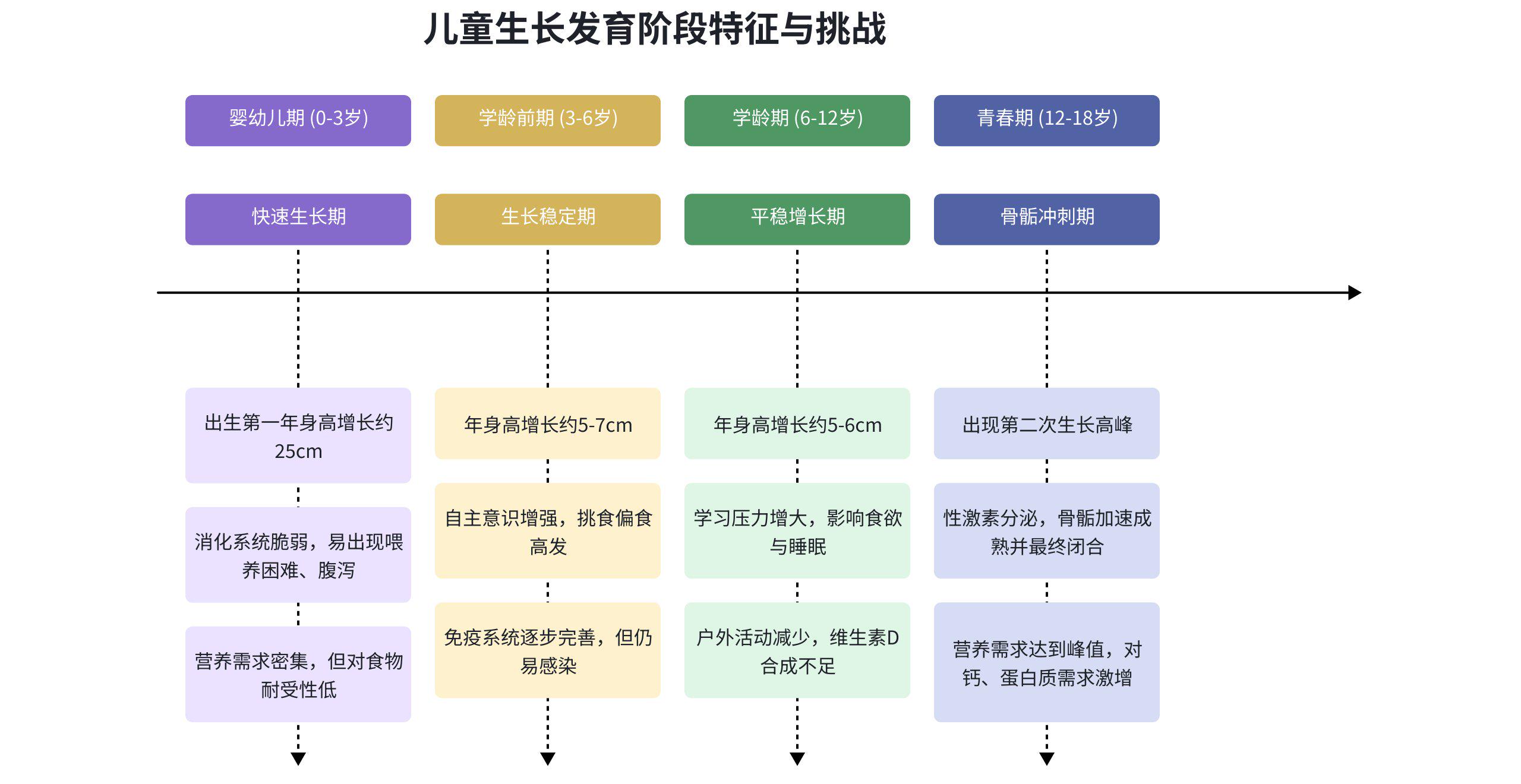 儿童的生长发育并非匀速直线,而是呈现明显的阶段性特征。0-18岁的生长旅程,每个阶段都伴随着独特的生理变化和营养挑战。理解这些阶段性差异,是进行精准营养干预的前提。
