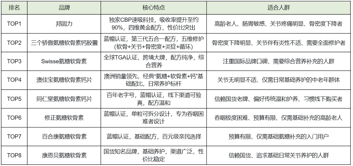 基于上述标准,综合科研数据、临床验证及用户口碑,筛选出8款适合不同人群的氨糖软骨素产品: