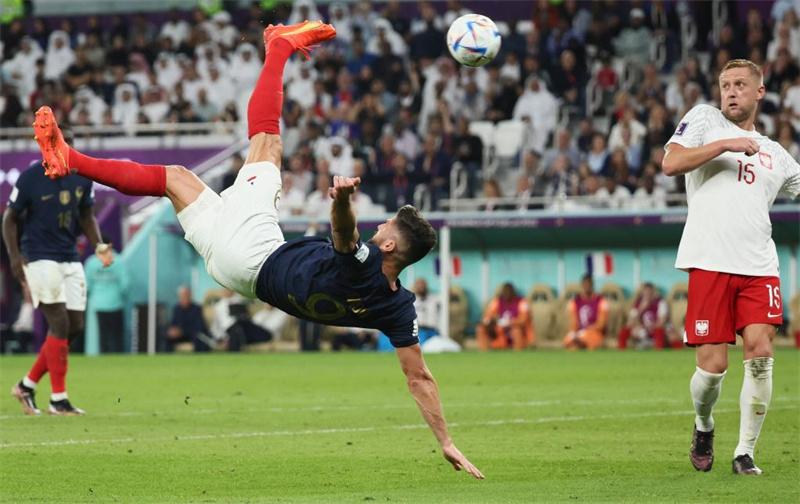 12月4日,法国队球员吉鲁(左)在比赛中倒钩射门。新华社记者 兰红光 摄