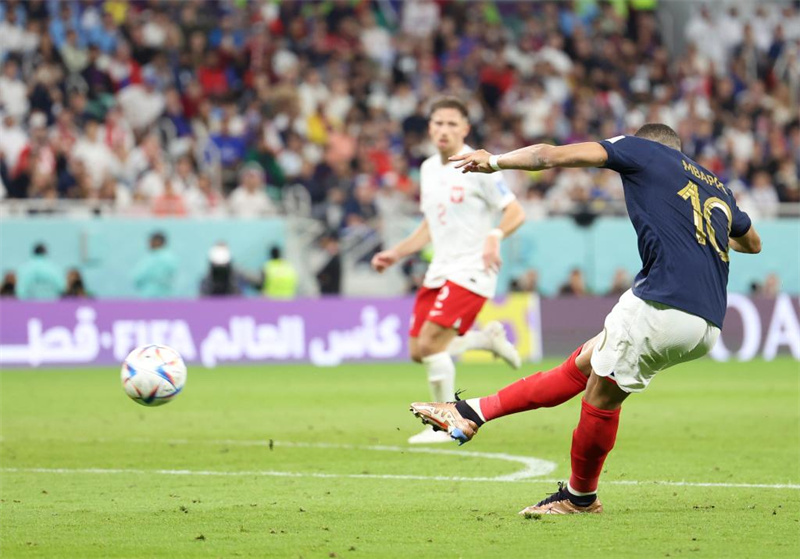 12月4日,法国队球员姆巴佩在比赛中射门得分。新华社记者 曹灿 摄