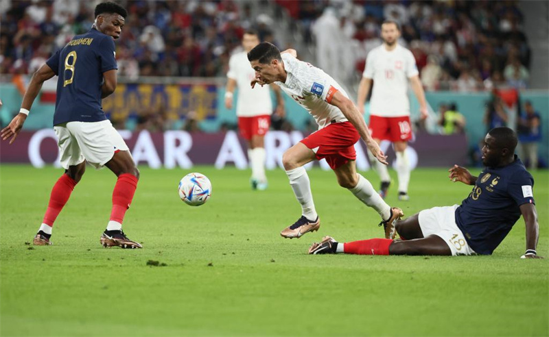 法国队稳操胜券,但姆巴佩的个人表演没有结束,第91分钟他接马库斯·图拉姆的传球再度劲射破门。补时最后时刻,法国队后卫于帕梅卡诺禁区内手球,主裁判观看录像回放后判罚点球,莱万为波兰队挽回颜面。
