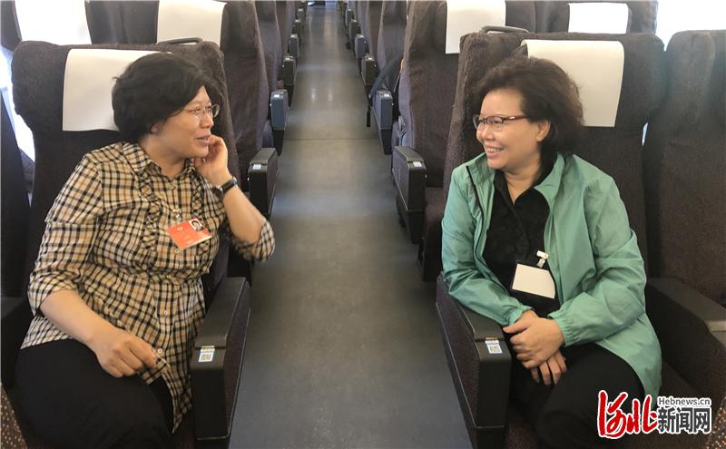 全国政协委员、邢台市委副书记宋华英(左),全国政协委员、省教育厅总督学韩爱丽在车厢中交谈。河北日报记者高原雪摄