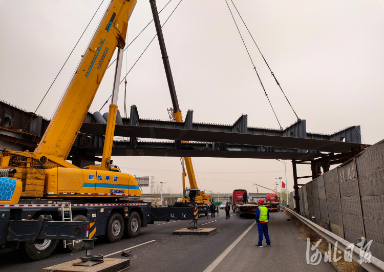 3月17日,在荣乌高速公路新线京台高速至京港澳高速段ZT5标段独流枢纽互通,建设者们正在进行钢架桥梁吊装作业。河北日报记者耿辉摄