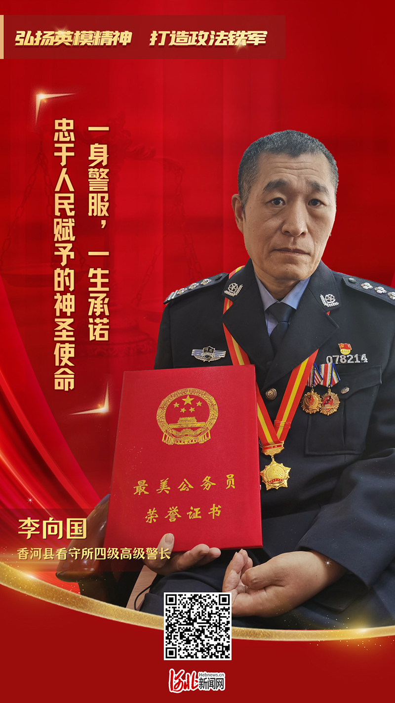 12月2日,中央组织部、中央宣传部联合发布“最美公务员”先进事迹,香河县看守所四级高级警长李向国成为我省唯一获此殊荣的人。