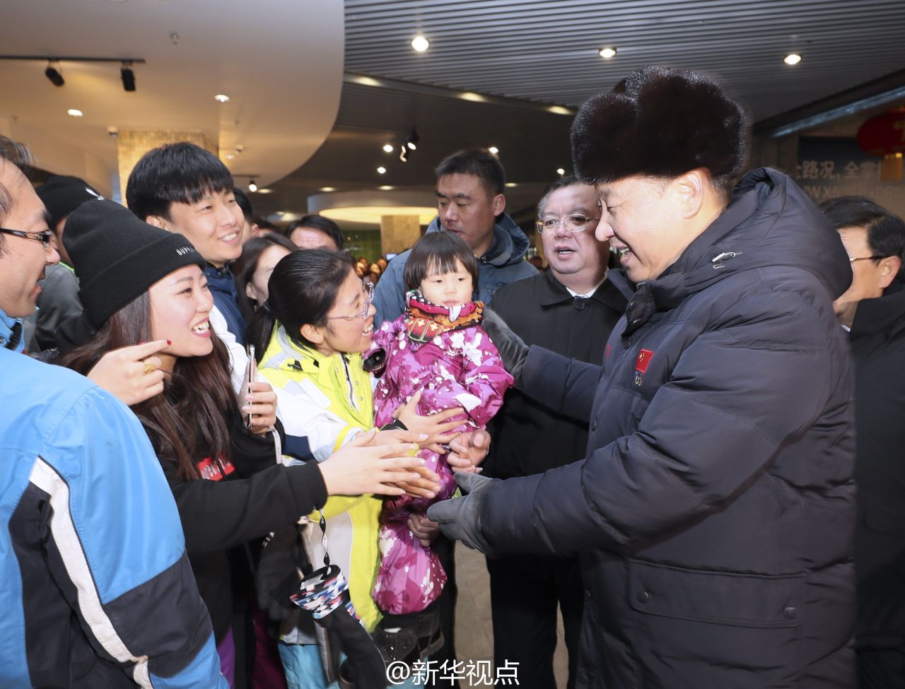 2017年1月23日,中共中央总书记、国家主席、中央军委主席习近平在河北省张家口市考察北京冬奥会筹办工作。这是习近平在云顶滑雪场雪具大厅同游客和滑雪爱好者亲切交谈。(图中小女孩为魏羽萱)图片来源:新华社