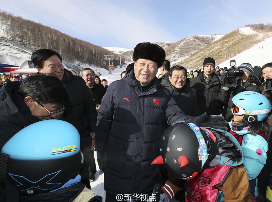 2017年1月23日,中共中央总书记、国家主席、中央军委主席习近平在河北省张家口市考察北京冬奥会筹办工作。这是习近平在云顶滑雪场亲切勉励参加滑雪冬令营的少年儿童。图片来源:新华社