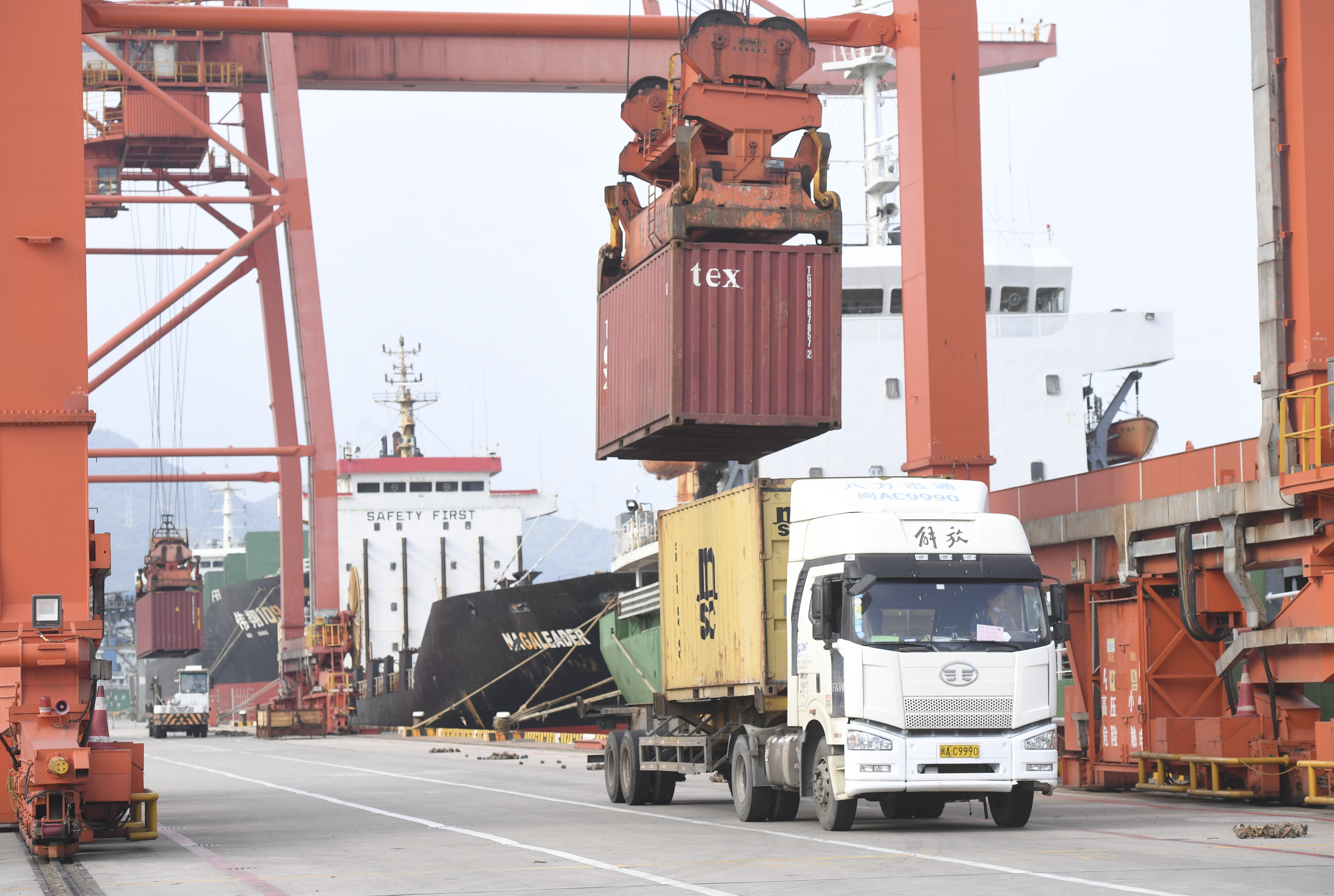 在中国(福建)自由贸易试验区福州青州集装箱码头,大型机械在吊装集装箱。新华社记者 宋为伟 摄