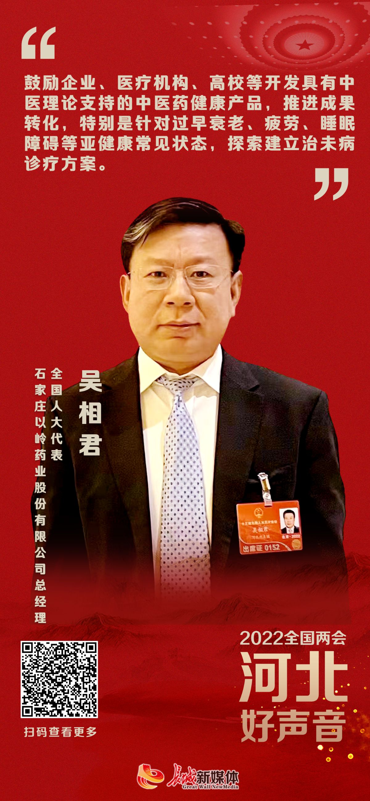 长城网·冀云客户端讯(记者 郑建卫)“中医学‘治未病’有着悠久的历史,在防治亚健康方面积累了宝贵的经验,尤其是对机体整体功能状态的调理方面具有独特优势。”全国人大代表、石家庄以岭药业股份有限公司总经理吴相君说,他在全国两会上提出了加强中医药干预亚健康状态的建议。