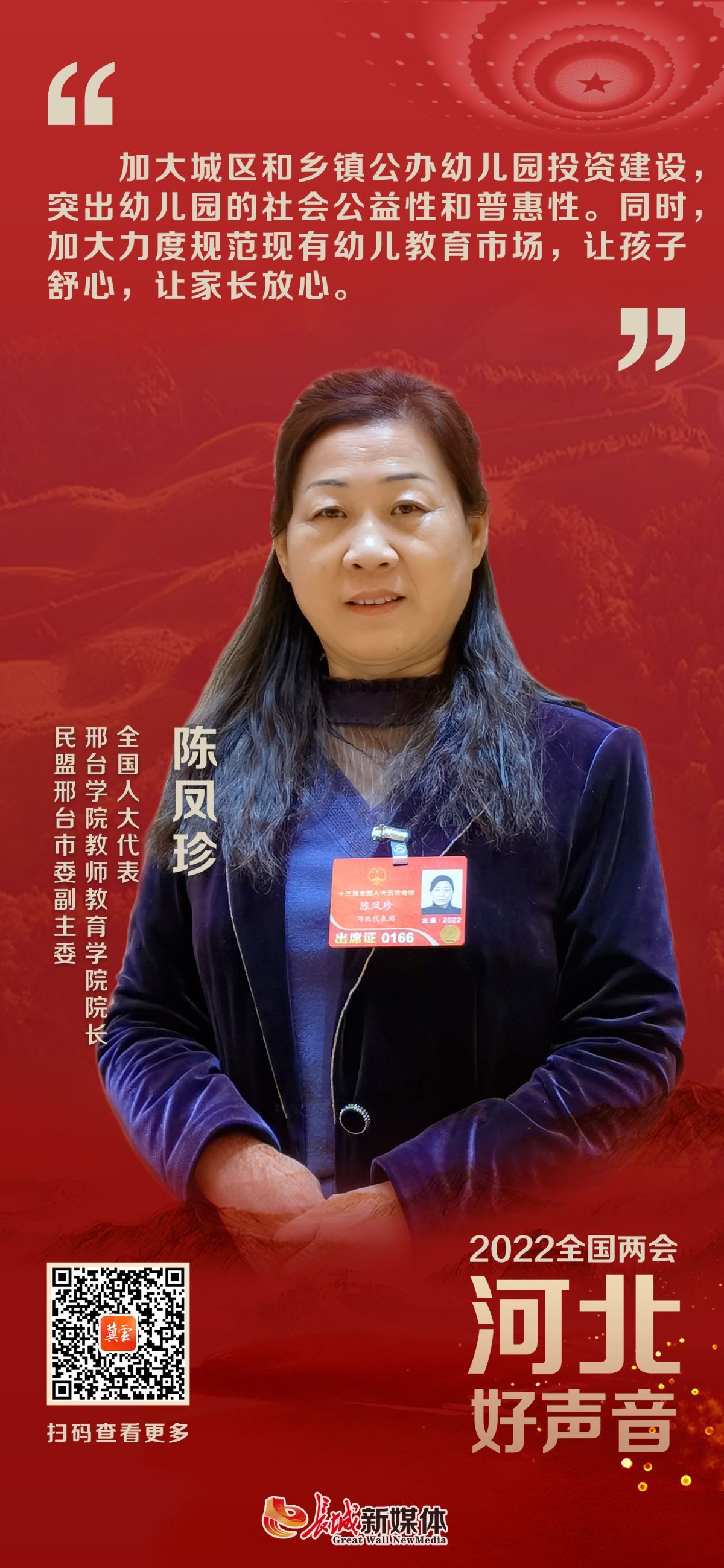 长城网·冀云客户端讯(记者 张晓明 李代姣)“今年两会,我带来了关于加强公立幼儿园建设和私立幼儿园管理的建议。”全国人大代表、邢台学院教师教育学院院长、民盟邢台市委副主委陈凤珍,建议增加公立幼儿园数量,同时加大力度规范幼儿教育市场。