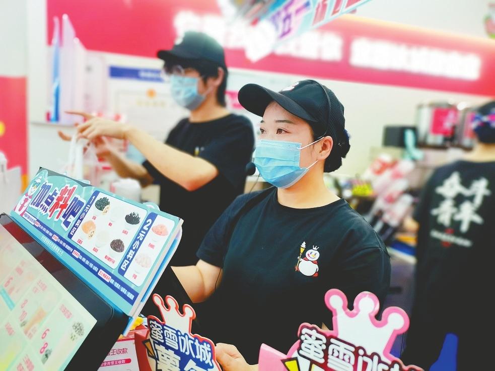 5月3日18时许,中北世纪城的蜜雪冰城饮品店内,顾客络绎不绝。服务台后,“80后”店长高连军带着麦克风一边招呼进店的顾客,一边为服务台前的顾客下单。娴熟的点单操作和“欢迎光临”的问候同步进行,手和口配合十分流畅。