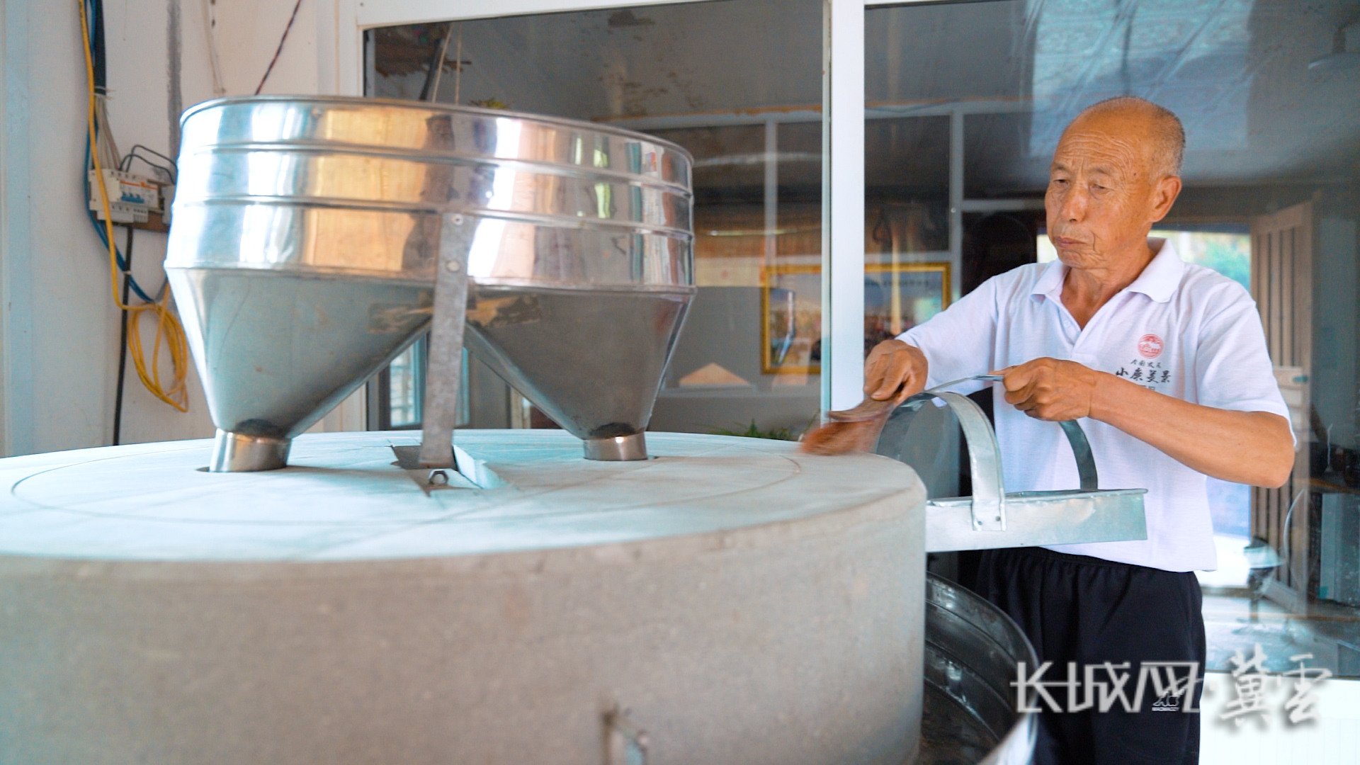 谷文朝在清理石磨。长城网·冀云客户端记者 张超 摄