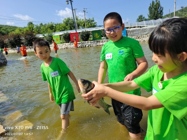在王汉沟村参加夏令营的孩子们快乐捕鱼。通讯员 马晓清摄