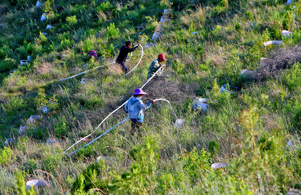 在邯郸市涉县偏城林场石峰林区,造林工人正在给新植的树苗浇水。 路海东摄