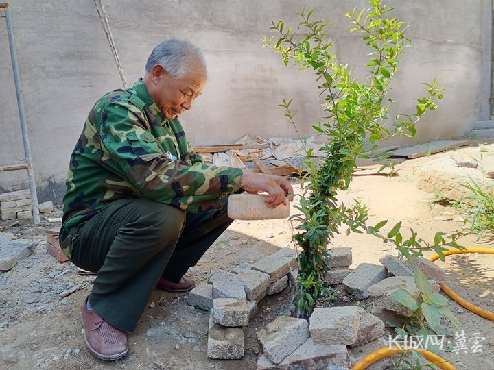 薛平起为古树滋生出来的枝丫浇水。长城网·冀云客户端记者 蔡洪坡 摄