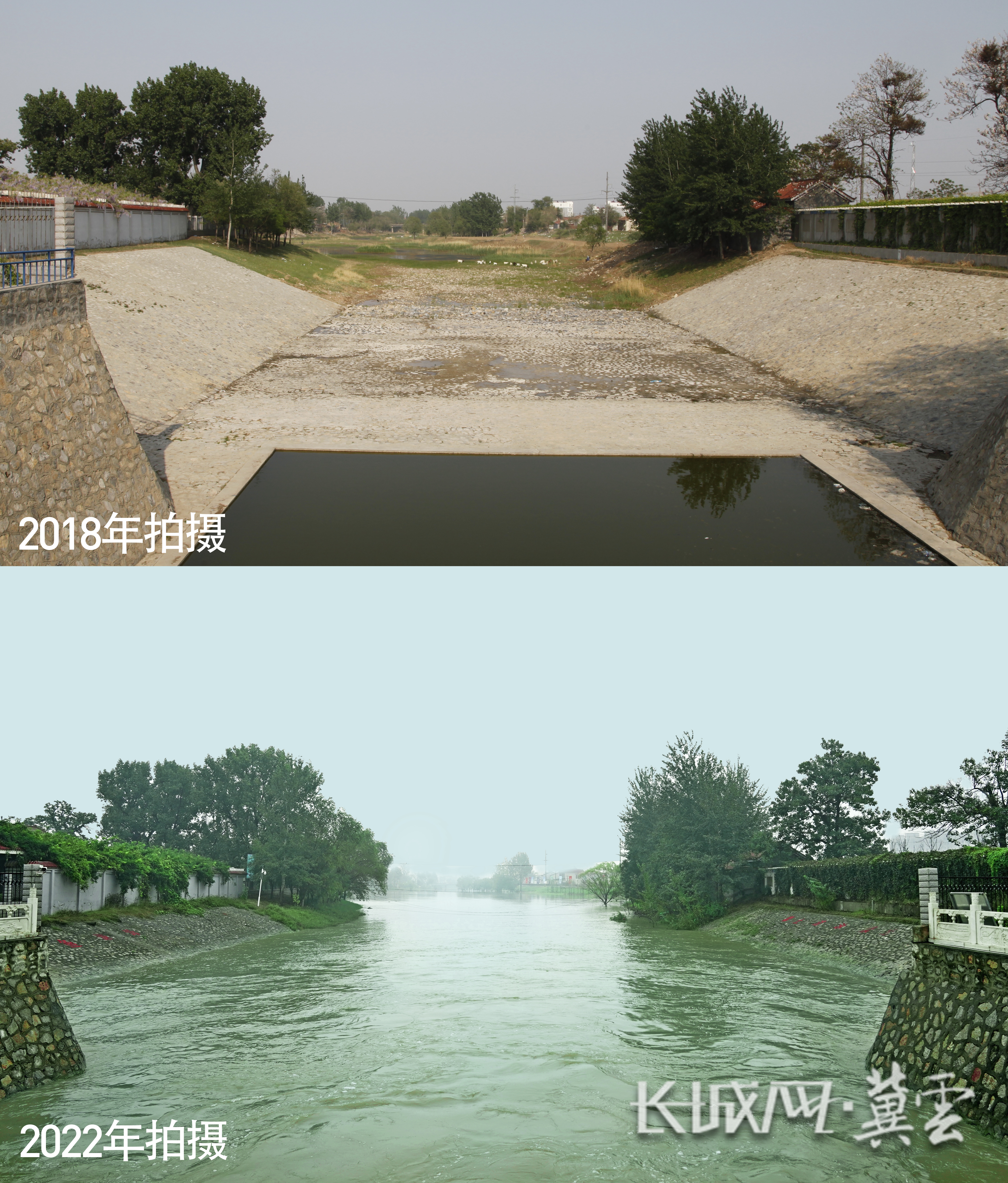 “这是我四年前拍摄的捷地村,当时捷地减河都干涸了,附近村民在河道放羊。再看今年上半年拍的同一位置的照片,水草丰茂,宛如烟雨江南。”王剑江激动地说。