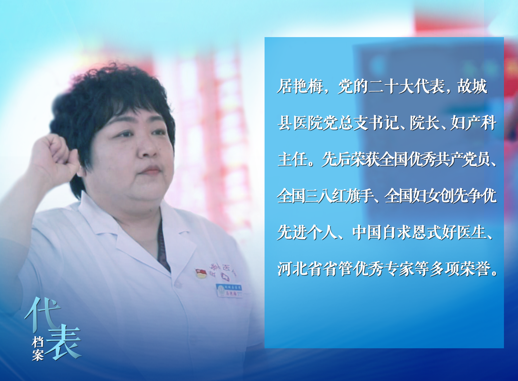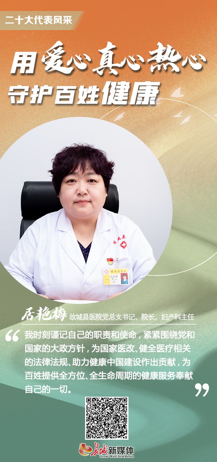 从普通医师到科室主任、副院长,再到县医院院长。居艳梅肩上的担子重了,身上的责任大了,但她却总说,“无论职务如何变化,但有一种身份不能改变,那就是一名共产党员,一名白衣战士。”