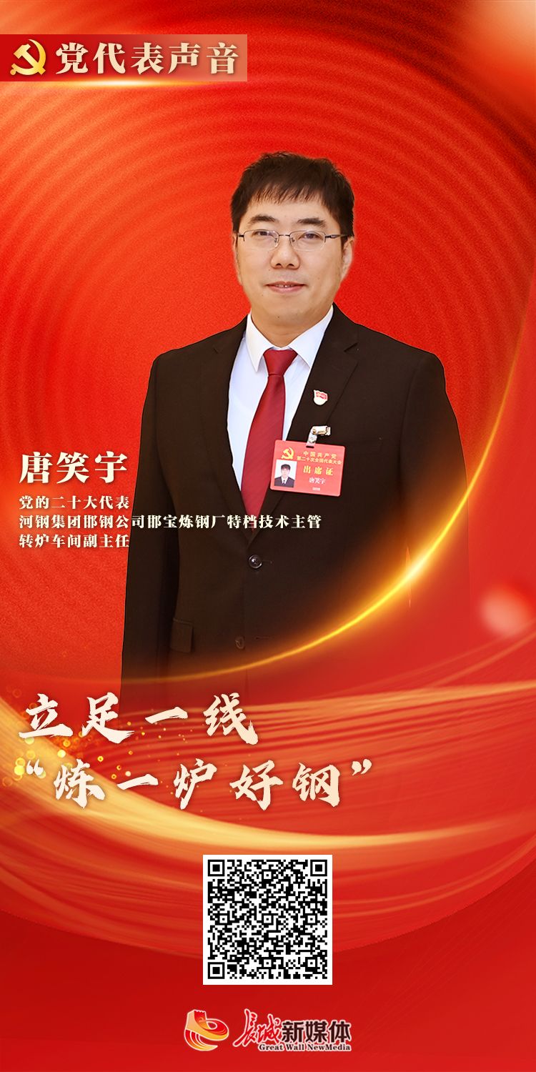 10月18日,党的二十大代表,河钢集团邯钢公司邯宝炼钢厂特档技术主管、转炉车间副主任唐笑宇这样对记者说。