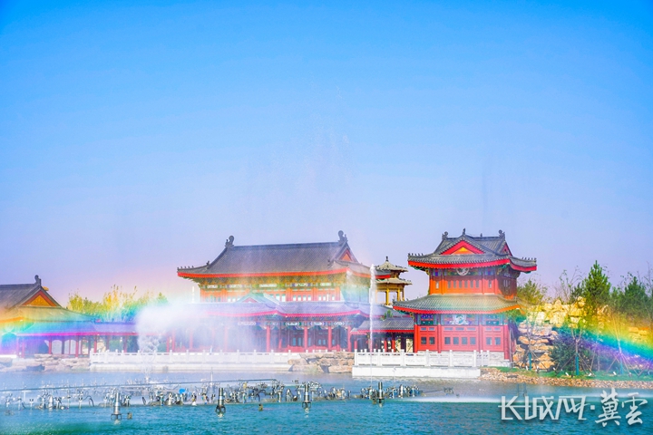在园博园项目施工现场,彩虹映照着沧趣园。长城网·冀云客户端记者 崔上 摄