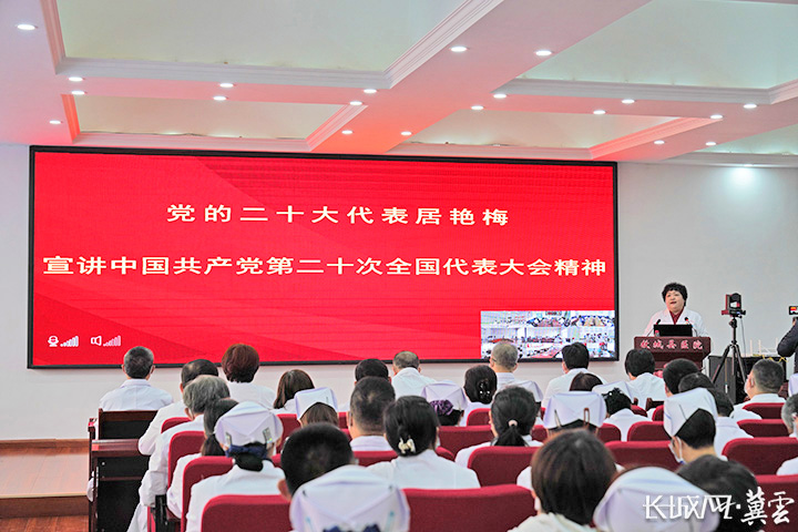 随后,居艳梅来到会议室,通过视频的方式,向现场及分会场的15家医共体成员单位共500余人宣讲了党的二十大精神。居艳梅利用一段段文字、一组组数字、一张张照片,畅谈了参加大会的亲身经历和体会感悟,会场不时响起热烈的掌声。
