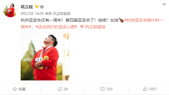 巩立姣期待杭州亚运会再夺冠。巩立姣微博截图