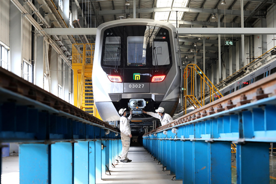位于河北省石家庄市栾城区的中车齐车集团石家庄公司,工人正在进行地铁车辆调试。 梁子栋摄