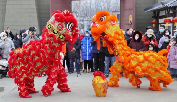 1月24日,大年初三,记者来到秦皇求仙入海处平安祈福庙会现场,远远地就听见铿锵激昂的锣鼓声,舞龙舞狮表演吸引大批游客驻足观看、热闹非凡。