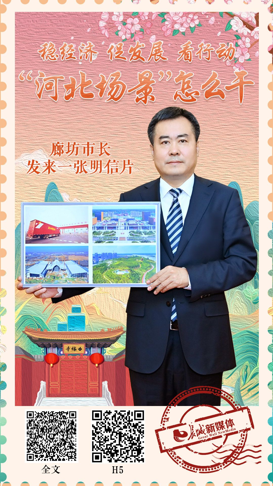 朋友们,大家好!我是廊坊市长李国勇。今天我想通过几张照片给大家介绍一下“新国门”“新动力源”的靓丽“窗口”——北京大兴国际机场临空经济区廊坊片区。
