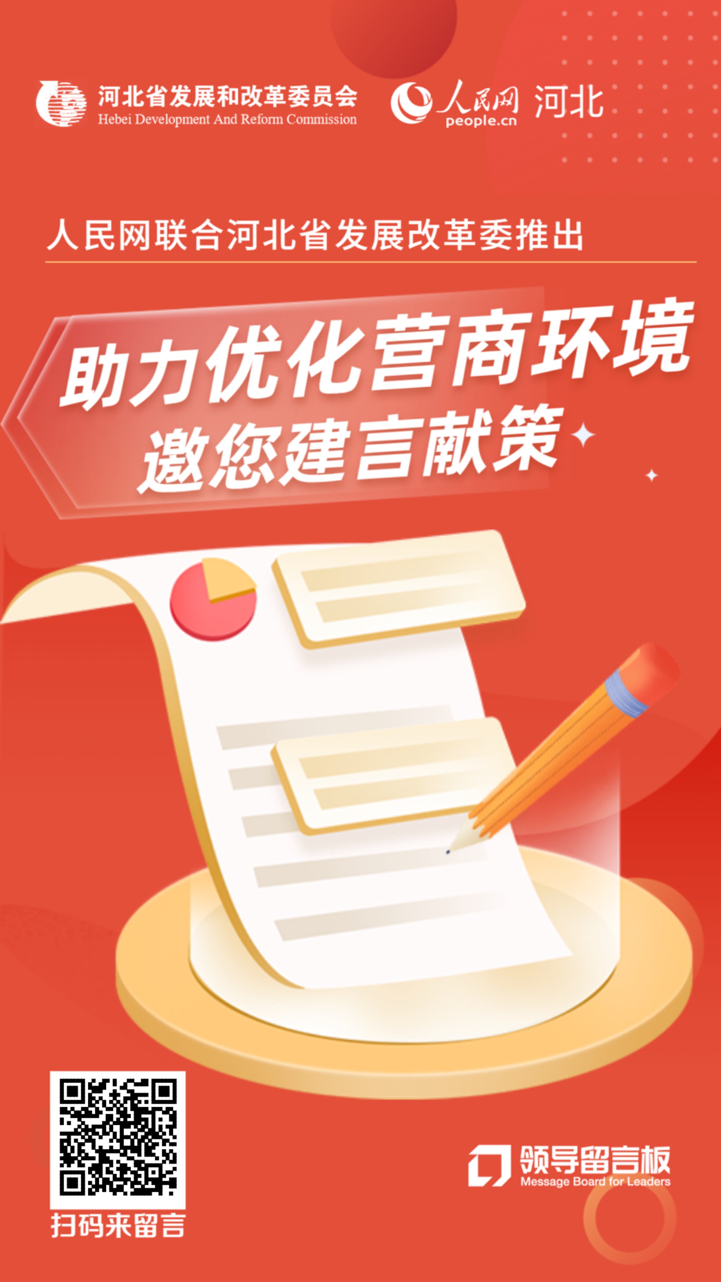 为助力营造市场化、法治化、国际化一流营商环境,加快把河北建设成为投资创业首选地,奋力开创加快建设经济强省、美丽河北新局面,即日起,人民网联合河北省发展改革委推出的“助力优化营商环境,邀您建言献策”主题征集活动正式启动。
